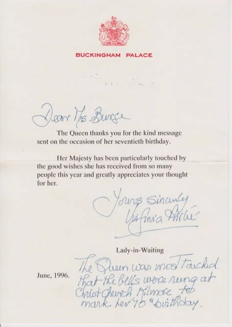 Historically church bells were originally used to call people to worship, or in times of strife, to warn of an impending attack. They have been tolled for funerals - traditionally once for each year of the deceased persons life. In happier times, a peal of bells would be rung at a wedding as a mark of a joyful occasion in the parish. Pictured is Fr Kim Benton, Rector of Kilmore, ringing the bell (we don’t have a peal of bells!) at the recent wedding of Sarah and Paul Davidson at Christ Church. The bell was also rung 70 times back in 1997 to mark the 70th birthday of our Queen (see letter below from Buckingham Palace thanking us).