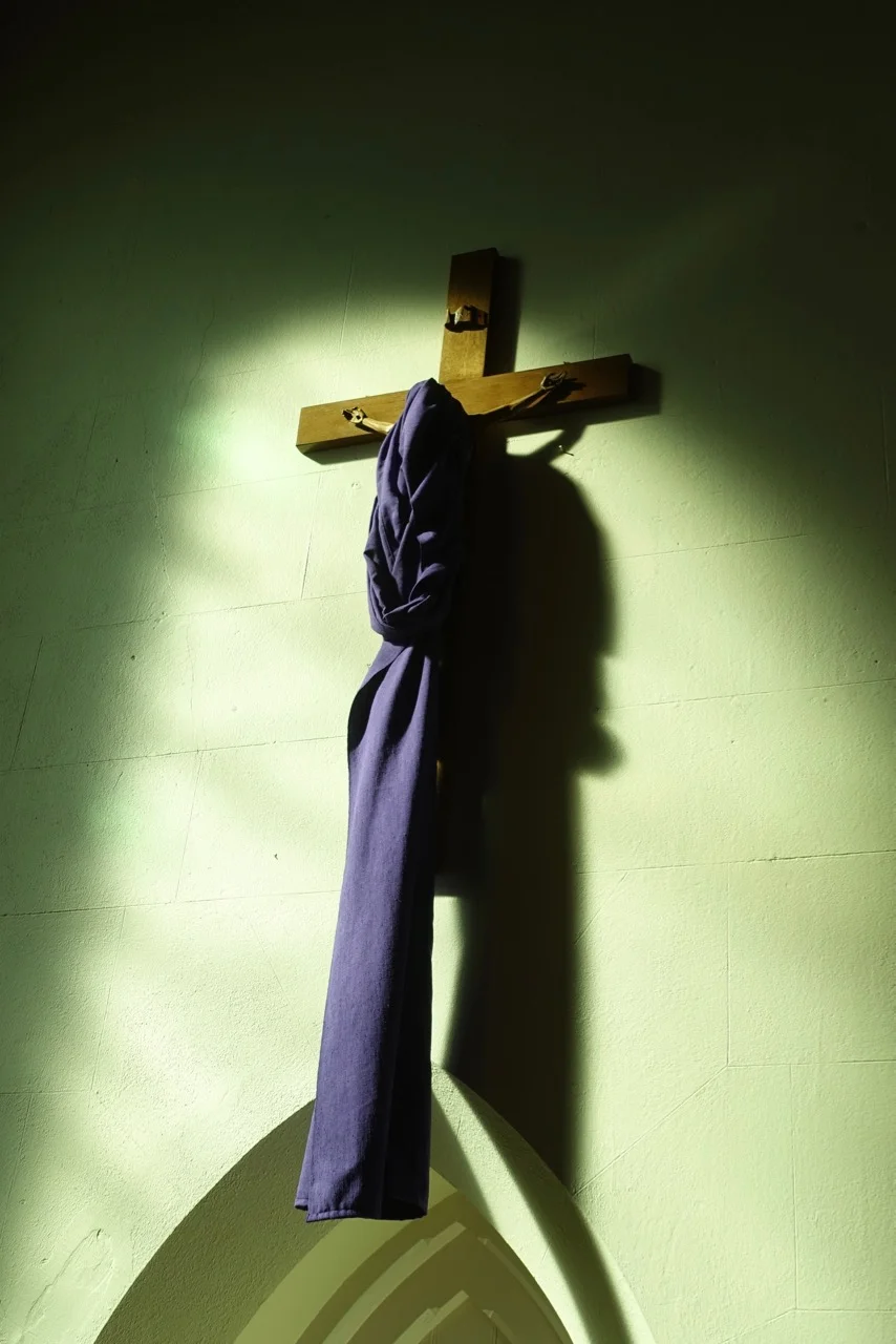 Pictured: The bare church; the empty tabernacle; the consecrated bread and wine from Maundy Thursday on the Altar of Repose; the sun shining through on our covered crucifix at the end of the service; the bare and rugged cross for Veneration of the Cross; the Christ Church singing group; the seven candles representing the 'seven last words'.