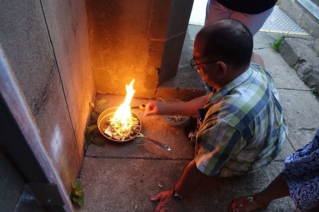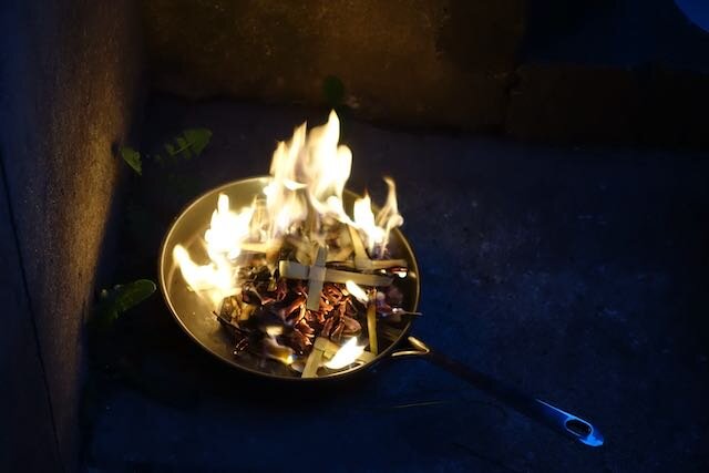 Each Shrove Tuesday, our parish prepare for Lent by having a shared pancake supper in the church, before removing all flowers, and then ceremonially burning the palm crosses from the previous year to turn into ash for Ash Wednesday.